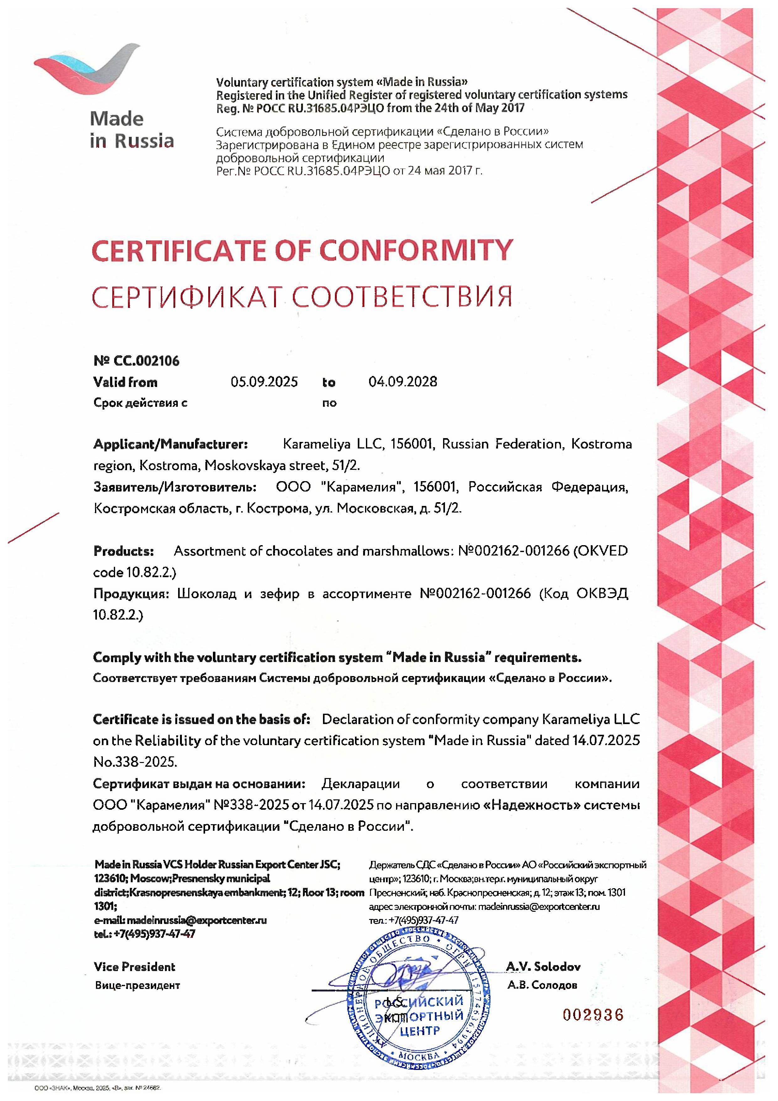 Компания "Карамелия" 5 сентября 2025 года получила сертификат "Сделано в России". Программа «Сделано в России» является единой площадкой для продвижения отечественной продукции, а также ценностей России и применения инструментов «мягкой силы» для создания позитивного имиджа страны за рубежом и направлена на достижение прироста объема экспорта несырьевых неэнергетических товаров».